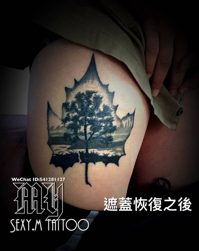 当前位置: 首页 >广东省珠海市纹身店-MY.sexy.m Tattoo纹身图案>黑灰不規則楓葉纹身图片_成品腿部写实纹身图案