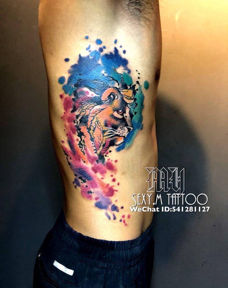 当前位置: 首页 >广东省珠海市纹身店-MY.sexy.m Tattoo纹身图案>水彩狮王风格纹身图片_腰部水彩纹身图案