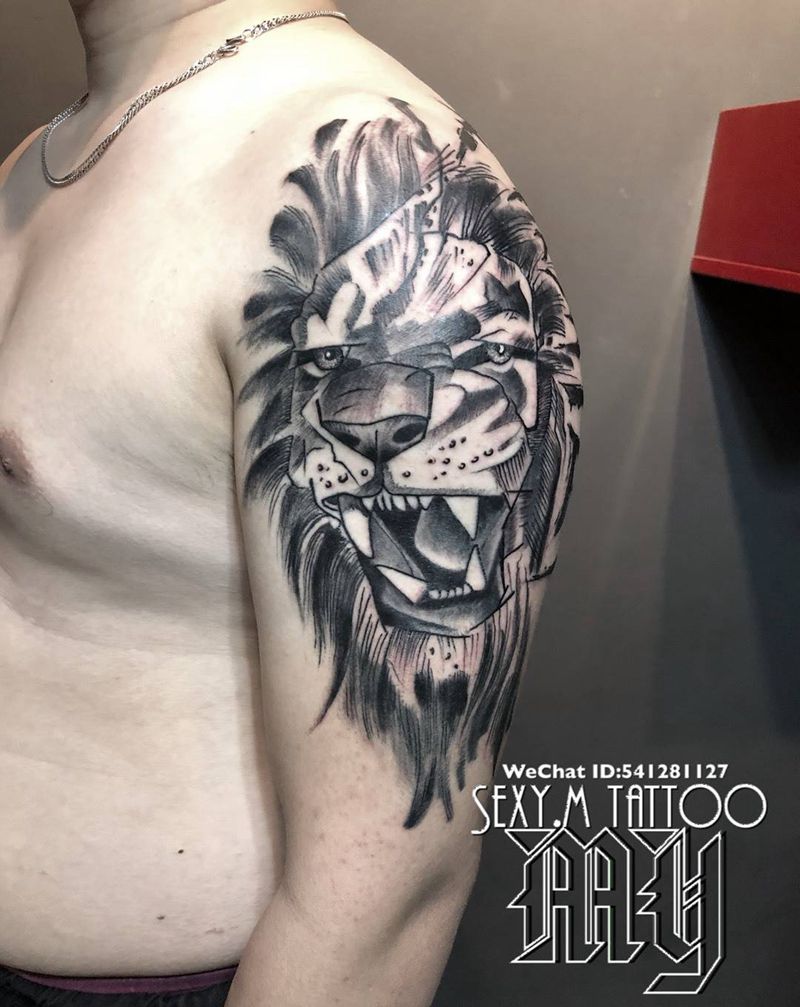 黑灰几何线条狮子纹身图片_成品手臂欧美动物纹身图案