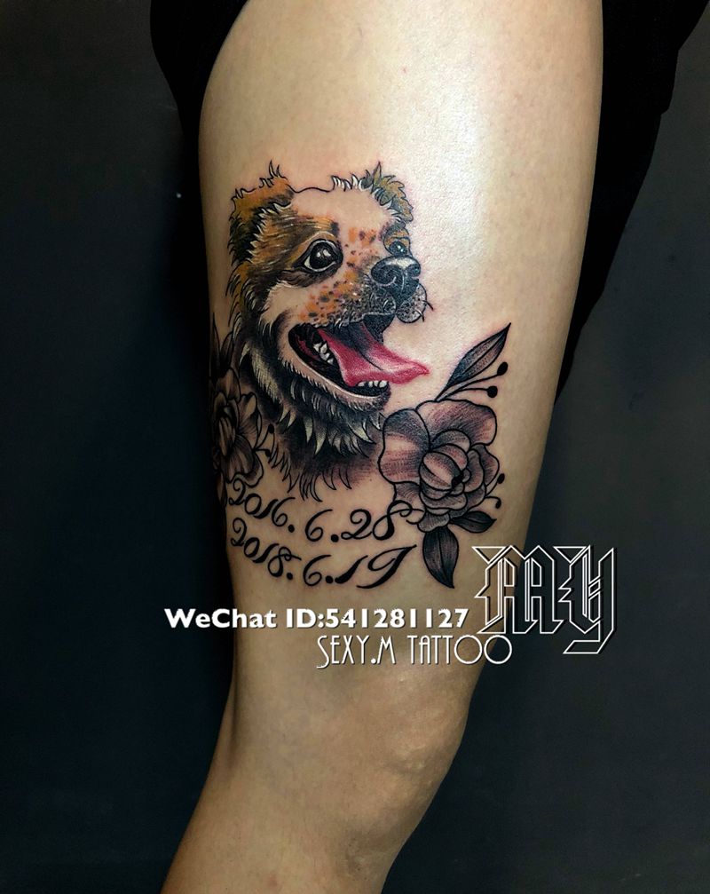 清新蝴蝶犬纹身图片_成品腿部欧美清新动物原创纹身图案