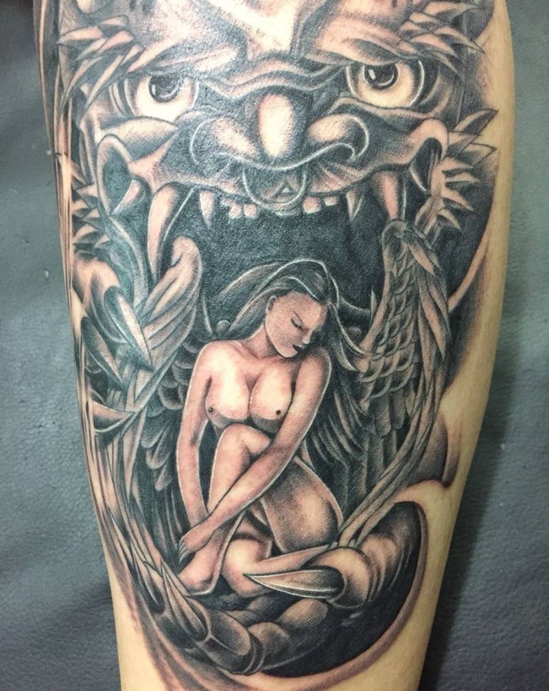 恶魔天使纹身图片_成品欧美腿部鬼神纹身图案