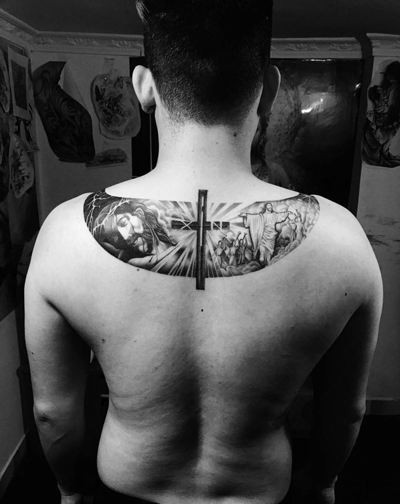死亡与重生纹身图片_成品背部欧美人物宗教写实纹身图案