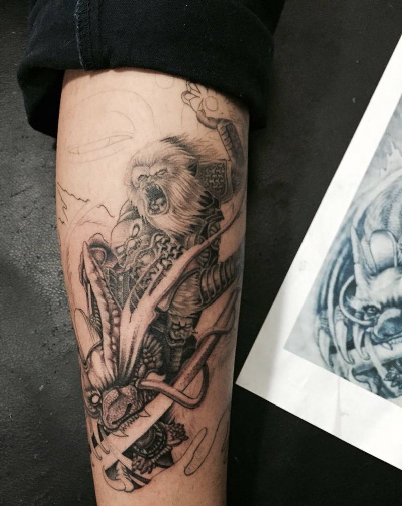 当前位置: 首页 >广东省珠海市纹身店-九纹龙纹身图案>未完待续纹身图片_成品腿部传统鬼神人物纹身图案