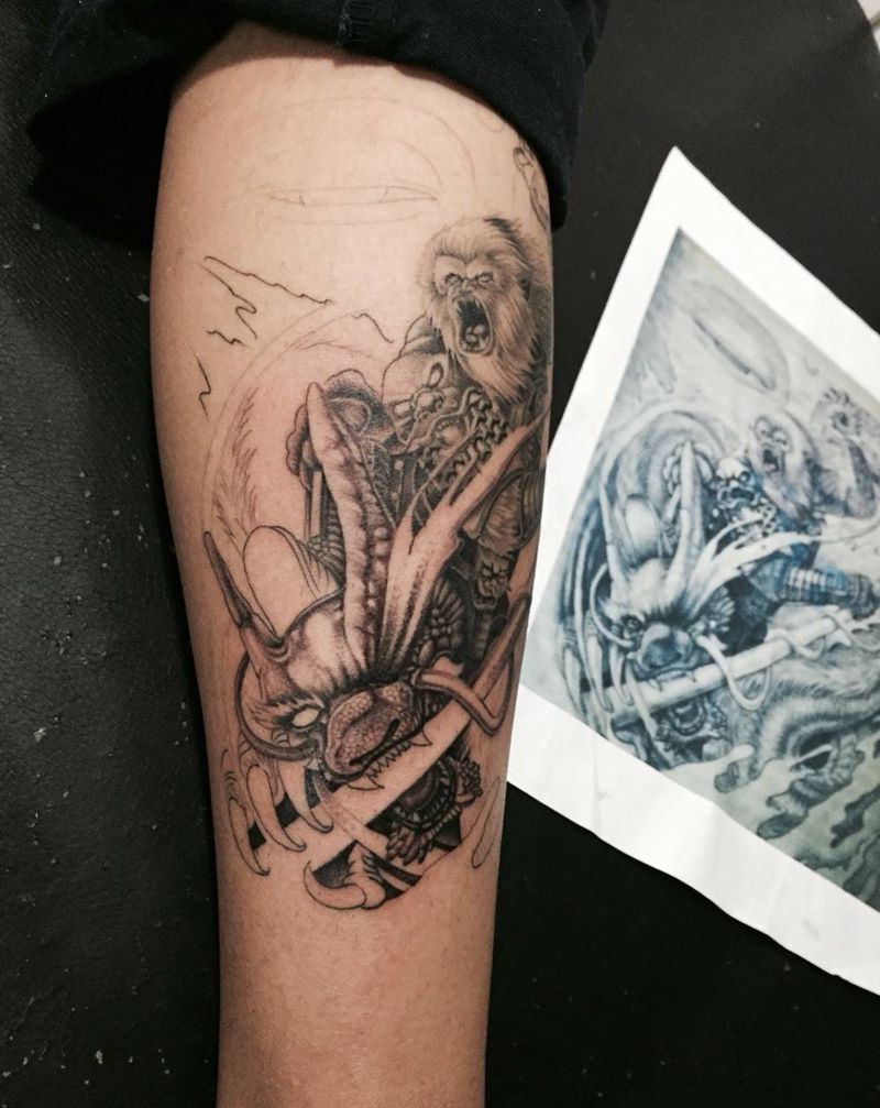 当前位置: 首页 >广东省珠海市纹身店-九纹龙纹身图案>未完待续纹身图片_成品腿部传统鬼神人物纹身图案