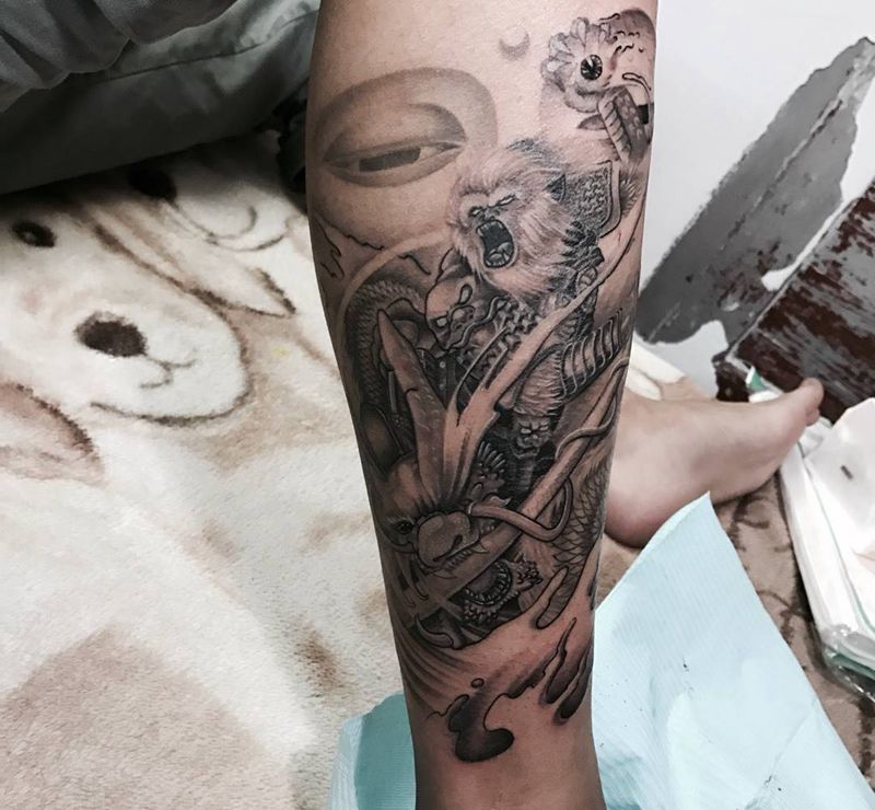 当前位置: 首页 >广东省珠海市纹身店-九纹龙纹身图案>悟空纹身图片_成品腿部传统鬼神人物纹身图案