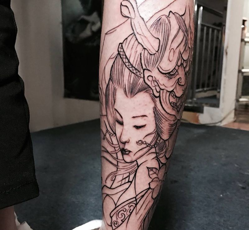 艺妓未完纹身图片_成品传统人物鬼神腿部纹身图案