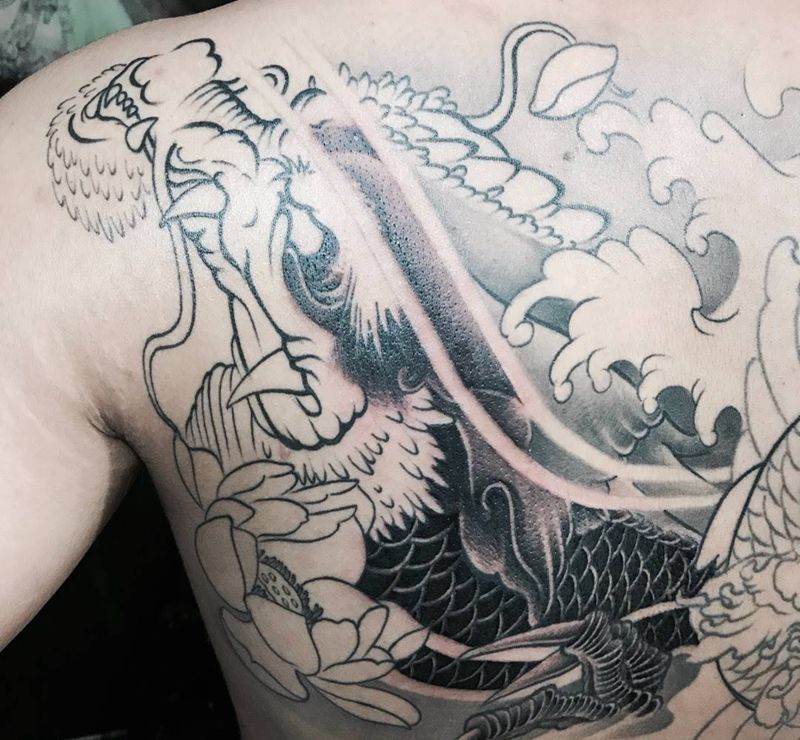 背龙鱼纹身图片_成品背部传统动物纹身图案