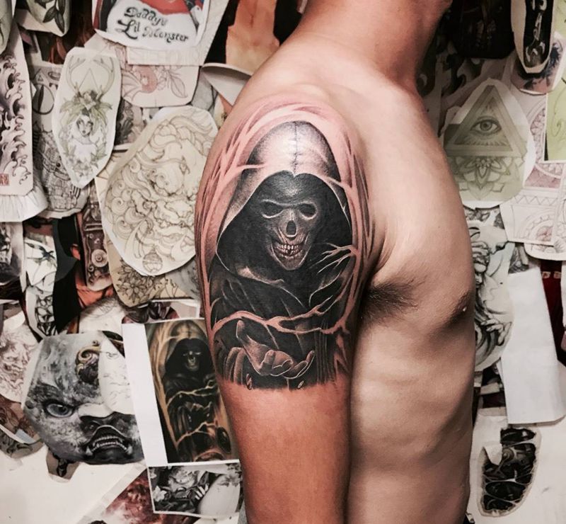 当前位置: 首页 >广东省珠海市纹身店-九纹龙纹身图案>死神纹身图片_成品手臂欧美写实鬼神纹身图案