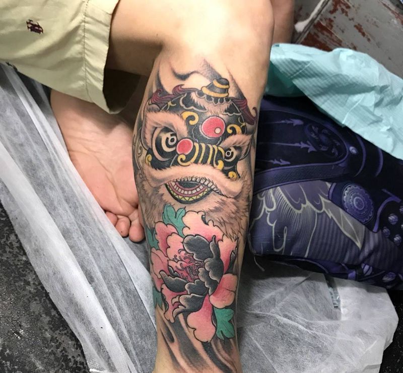 国粹 醒狮纹身图片_成品腿部传统原创动物纹身图案