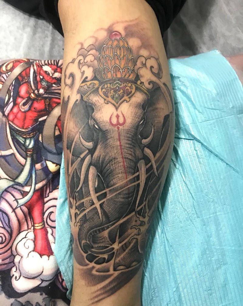 当前位置: 首页 >广东省珠海市纹身店-九纹龙纹身图案>象神纹身图片_成品腿部传统动物鬼神纹身图案