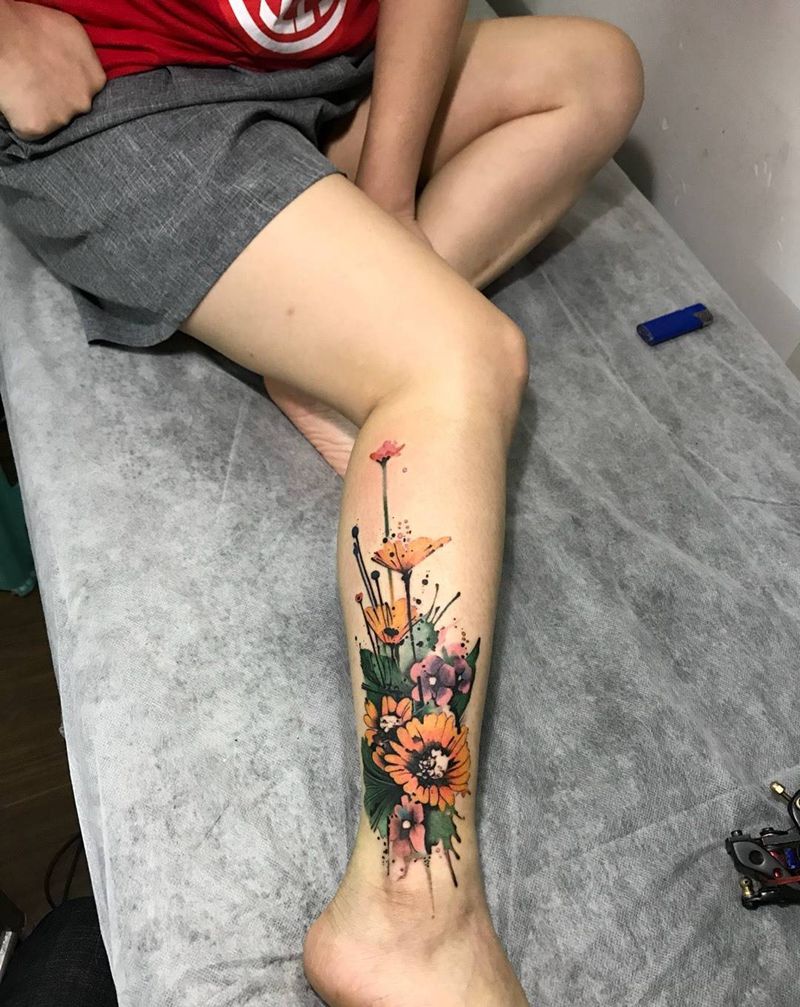 水墨花纹身图片_成品腿部脚部欧美清新植物静物纹身图案