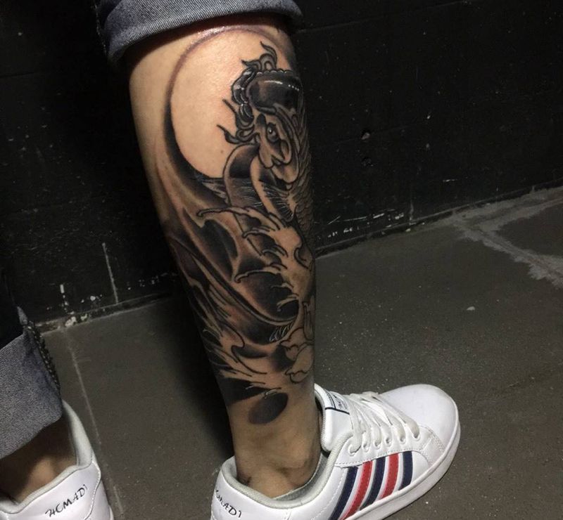 • T网红王老大花腿龙纹身图片_腿部新传统纹身图案
