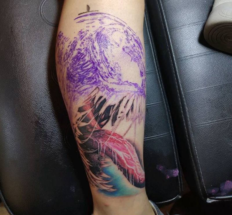 毒液(未完成)纹身图片_脚部腿部欧美写实水彩毒液漫威彩色写实纹身图案