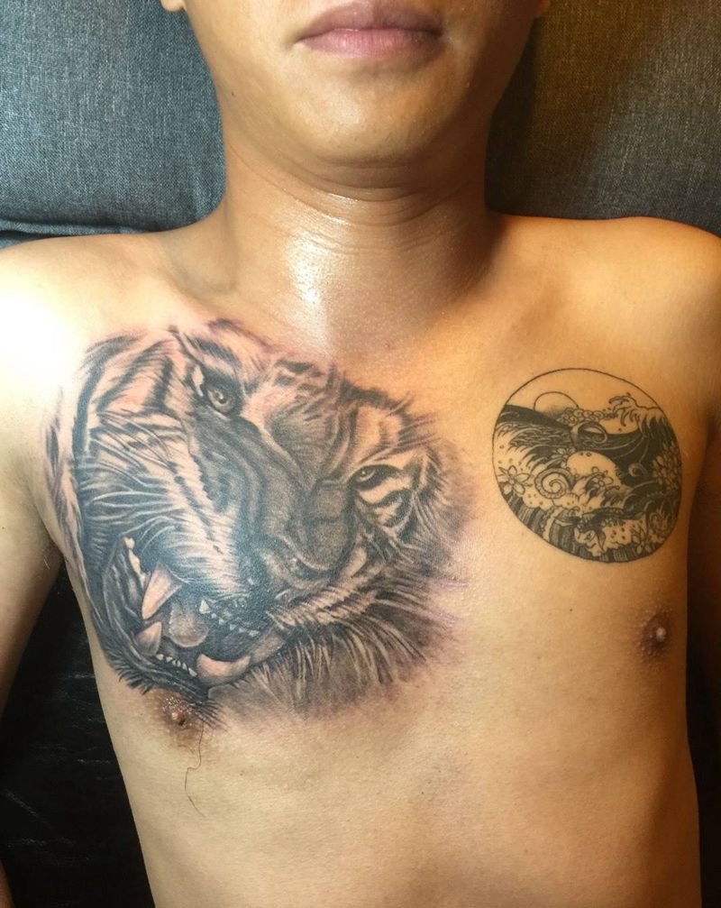 大猫纹身图片_胸部欧美写实动物老虎纹身图案
