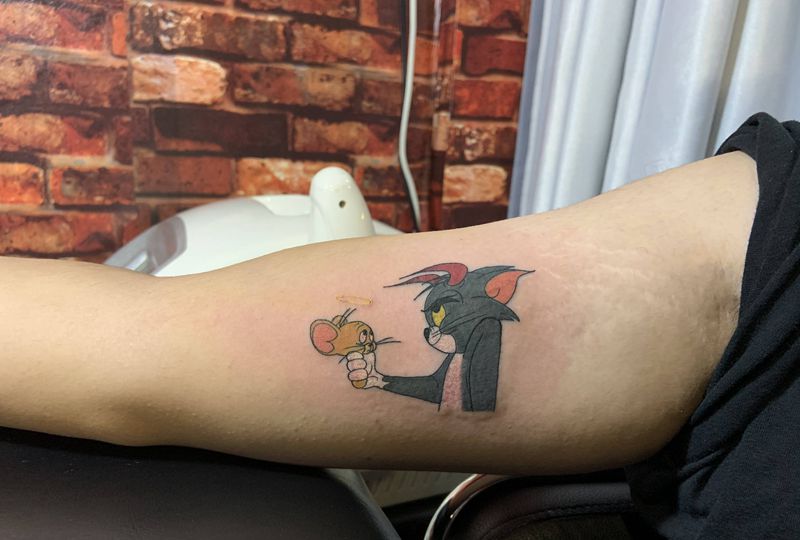 当前位置: 首页 >广东省汕头市纹身店-汕头羽刺青纹身图案>猫和老鼠纹身图片_手臂Old School纹身图案