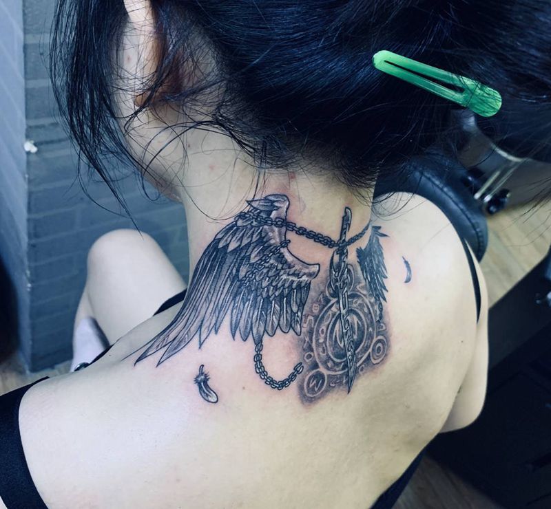 (仙剑奇侠传vs天使恶魔)翅膀纹身图片_颈部欧美写实纹身图案