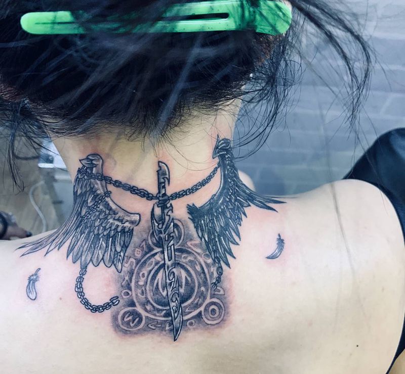 (仙剑奇侠传vs天使恶魔)翅膀纹身图片_颈部欧美写实纹身图案