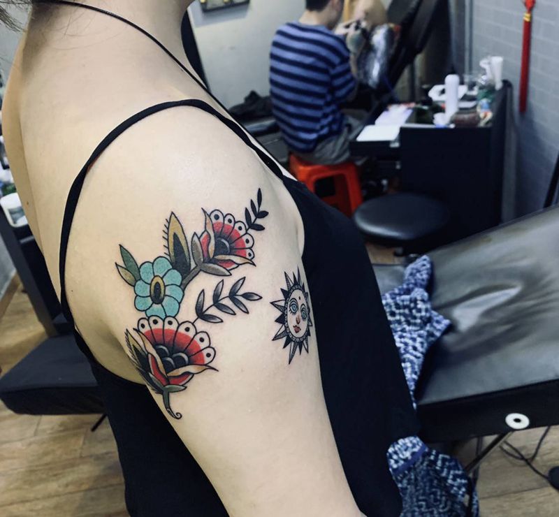 当前位置: 首页 >广东省珠海市纹身店-纹身(刺青先生)工作室纹身图案>old school花纹身图片_手臂手部Old School纹身图案
