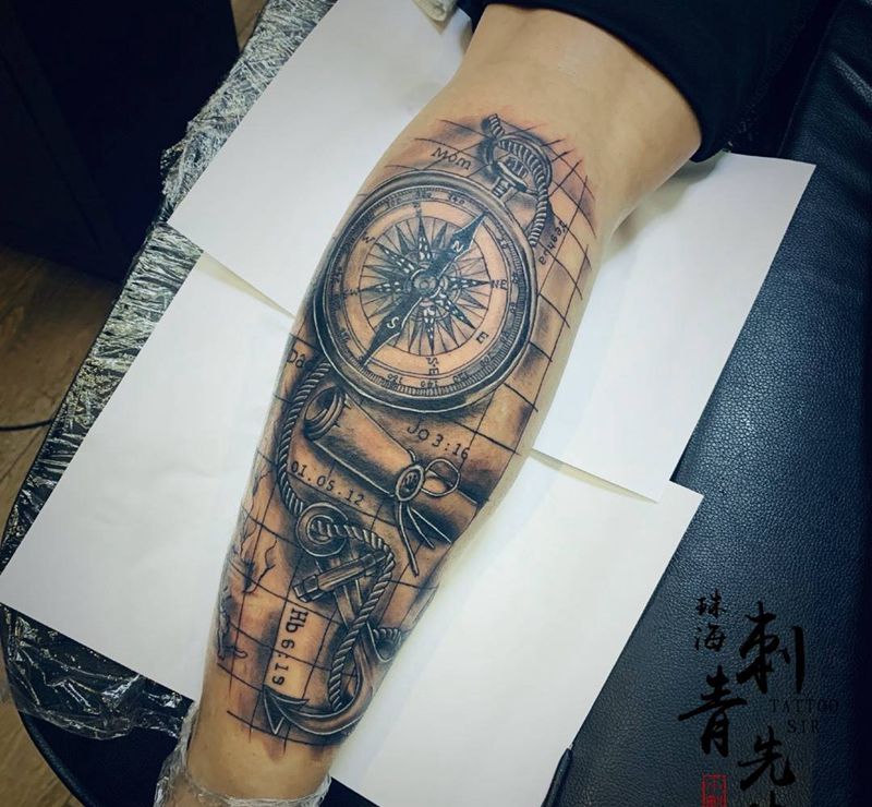 (航海图)纹身图片_腿部欧美写实纹身图案