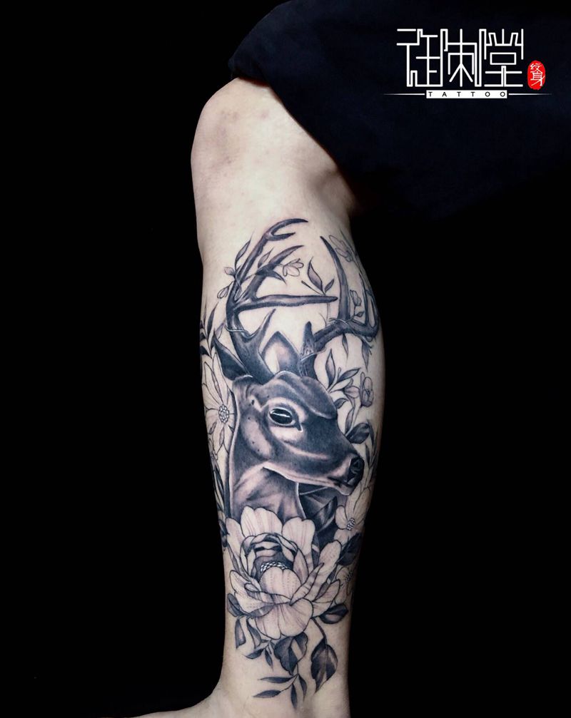 素花鹿 小腿纹身图片_腿部纹身图案