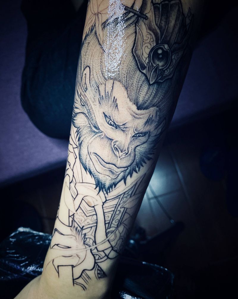 齐天大圣纹身图片_手部腿部新传统点刺悟空齐天大圣花臂纹身图案