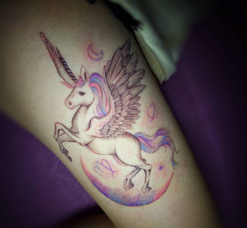 当前位置: 首页 >广东省汕头市纹身店-飒纹身图案>独角兽纹身图片_脚部腿部New School水彩独角兽小清新大腿纹身图案