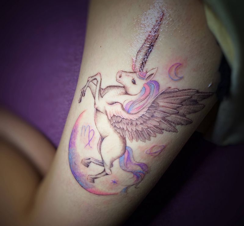 当前位置: 首页 >广东省汕头市纹身店-飒纹身图案>独角兽纹身图片_脚部腿部New School水彩独角兽小清新大腿纹身图案
