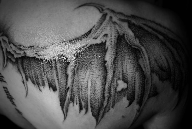 当前位置: 首页 >广东省汕头市纹身店-飒纹身图案>翅膀纹身图片_背部胸部New School点刺翅膀天使恶魔纹身图案