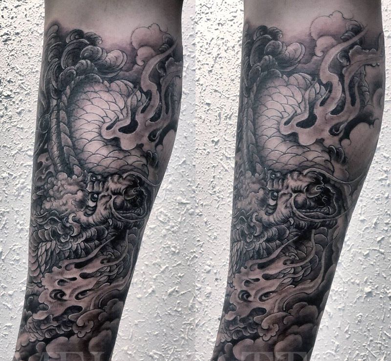 • T网红王老大花腿龙纹身图片_腿部新传统纹身图案