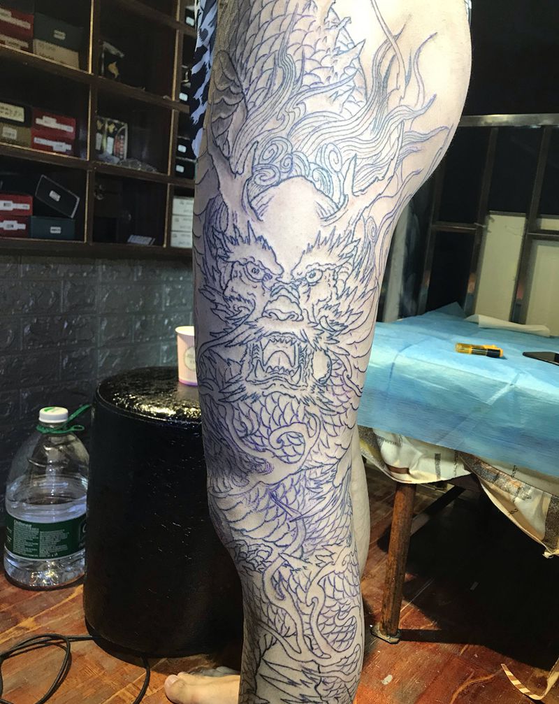 • T网红王老大花腿龙纹身图片_腿部新传统纹身图案