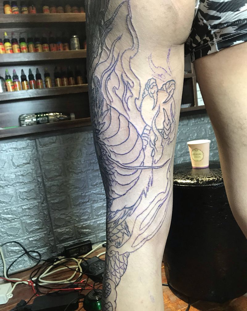 • T网红王老大花腿龙纹身图片_腿部新传统纹身图案