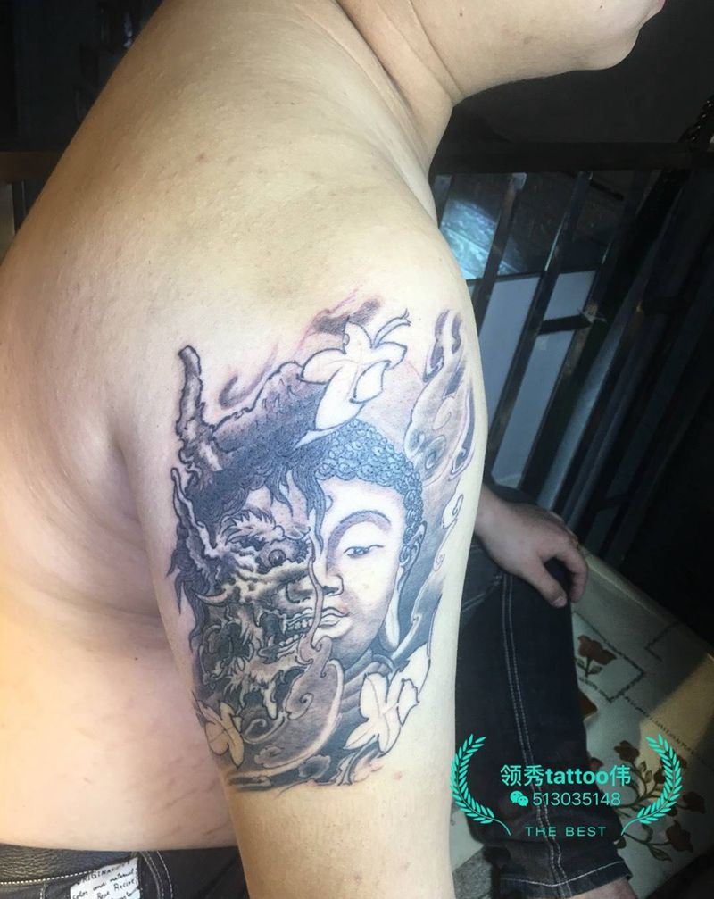 当前位置: 首页 >广东省汕头市纹身店-领绣纹身机构纹身图案>半魔半佛纹身图片