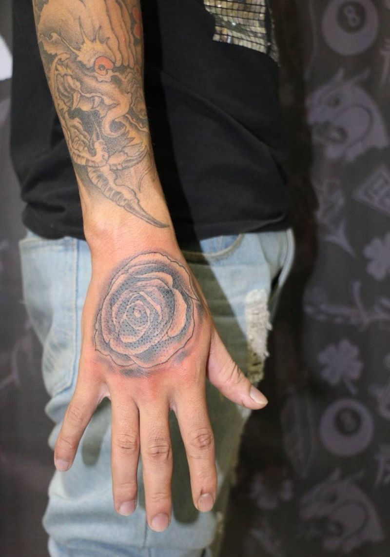 • 手背潮流时尚的玫瑰花眼睛纹身图案