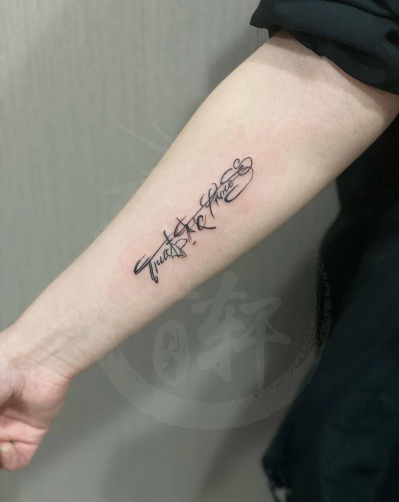 当前位置: 首页 >广东省汕头市纹身店-天龙纹身纹身图案>英文:相信过程纹身图片_手臂花体字纹身图案