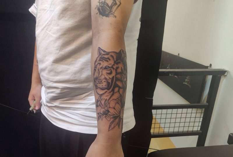 当前位置: 首页 >广东省佛山市纹身店-挣扎刺青工作室纹身图案>大猫纹身图片_手臂素花纹身图案