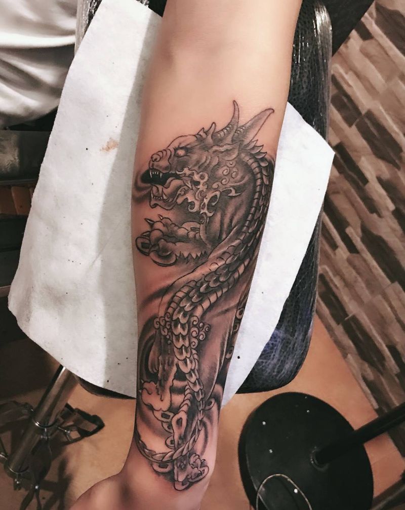 • T网红王老大花腿龙纹身图片_腿部新传统纹身图案