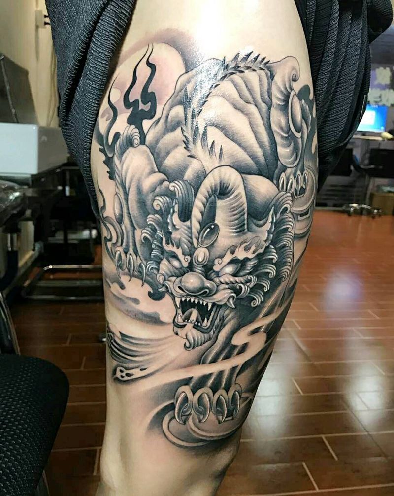 • T网红王老大花腿龙纹身图片_腿部新传统纹身图案
