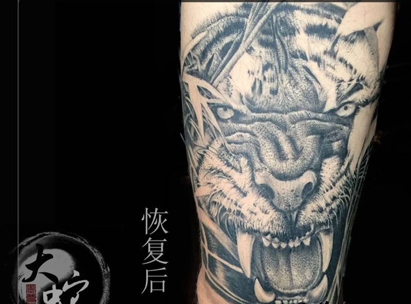 • T网红王老大花腿龙纹身图片_腿部新传统纹身图案