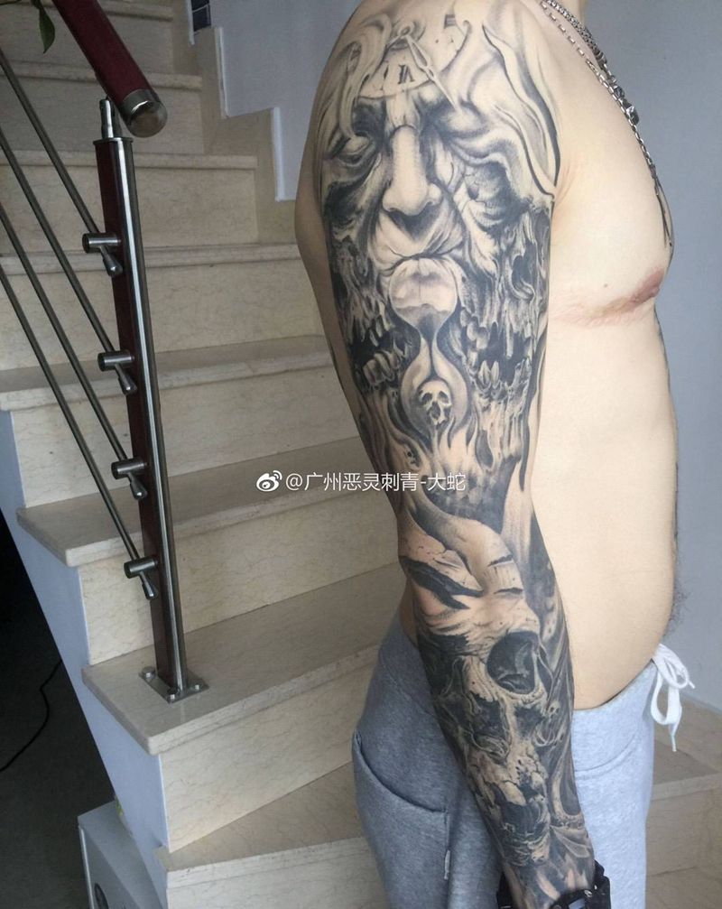 恢复后半年欧美花臂纹身图片_成品欧美手臂鬼神写实纹身图案