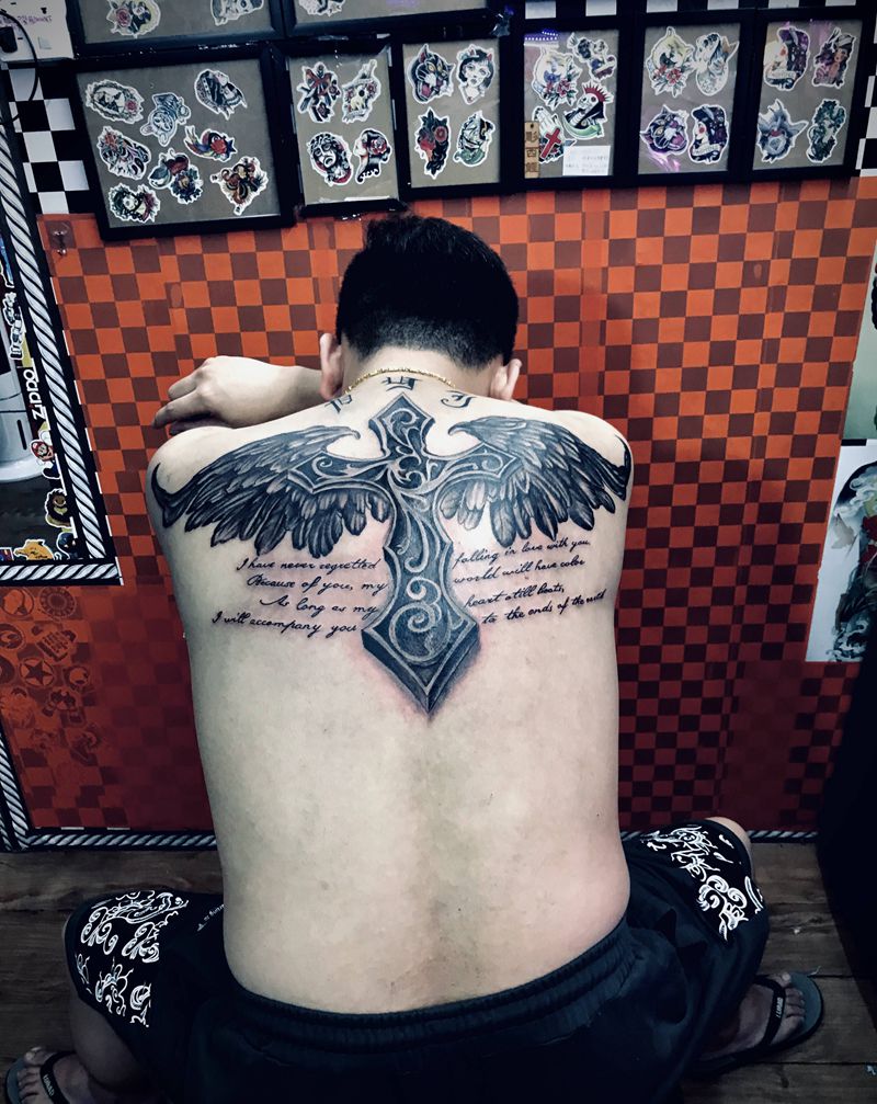 当前位置: 首页 >广东省佛山市纹身店-西樵鲤狮虎刺青纹身图案>后背翅膀纹身图片_背部纹身图案