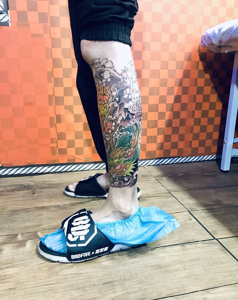 • T网红王老大花腿龙纹身图片_腿部新传统纹身图案