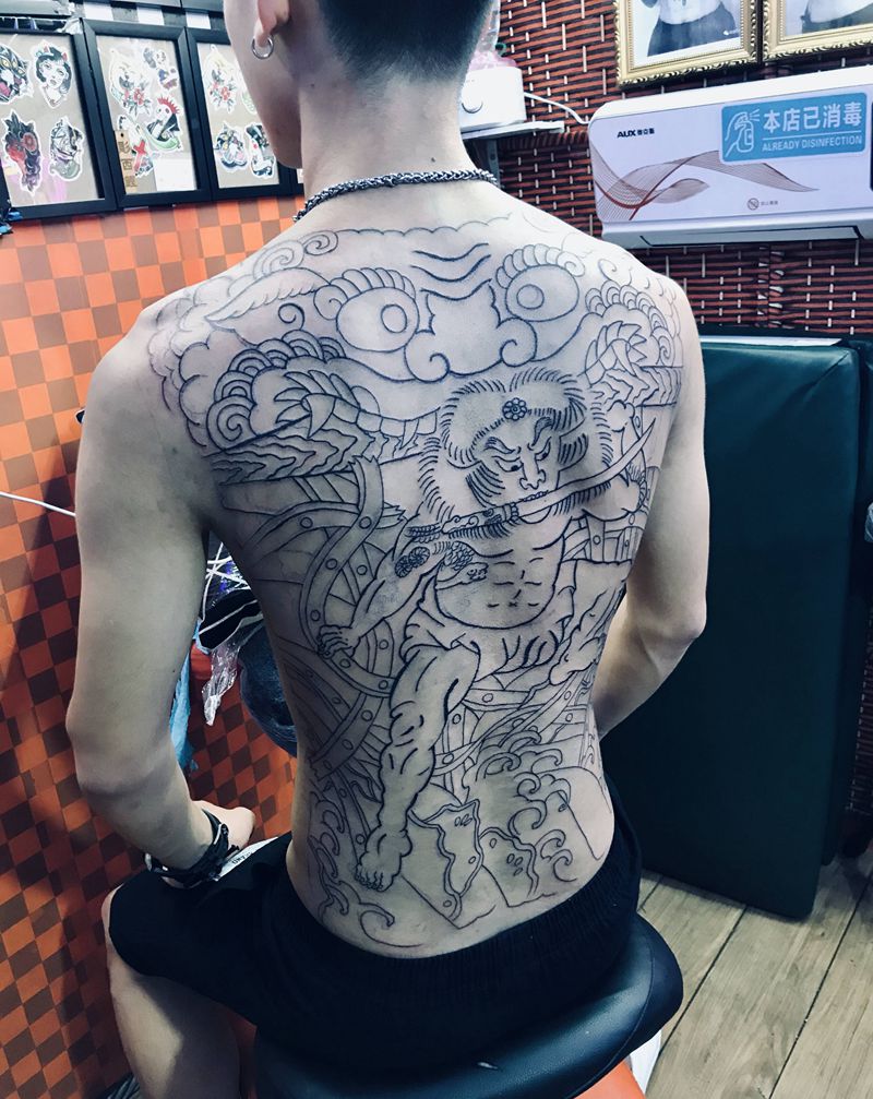 当前位置: 首页 >广东省佛山市纹身店-西樵鲤狮虎刺青纹身图案>满背顺哥线条纹身图片_背部纹身图案