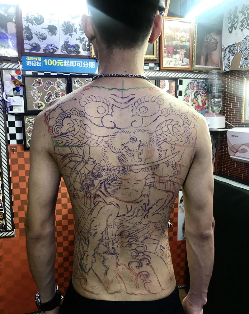 当前位置: 首页 >广东省佛山市纹身店-西樵鲤狮虎刺青纹身图案>满背顺哥线条纹身图片_背部纹身图案