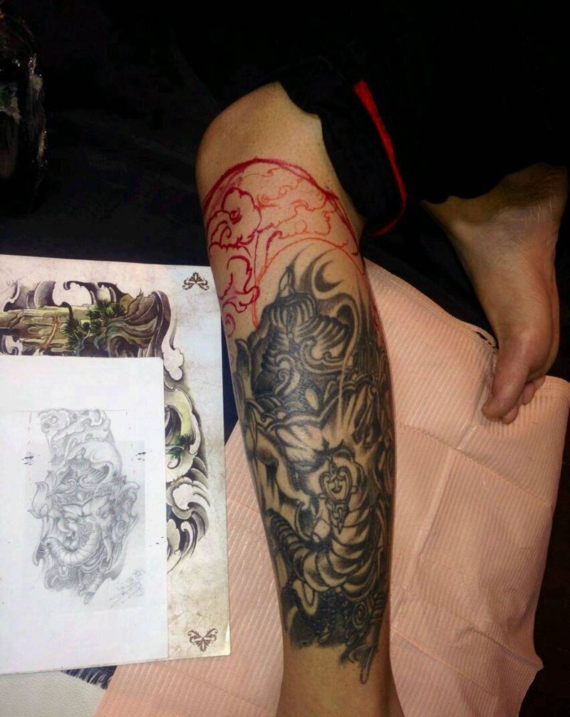 • T网红王老大花腿龙纹身图片_腿部新传统纹身图案