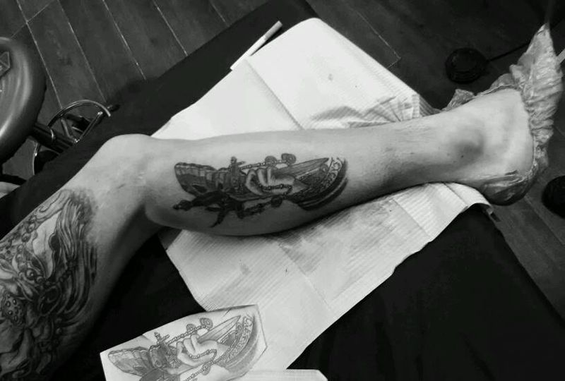 • T包小腿吹火男+阿多福纹身图片_腿部老传统新传统吹火男阿