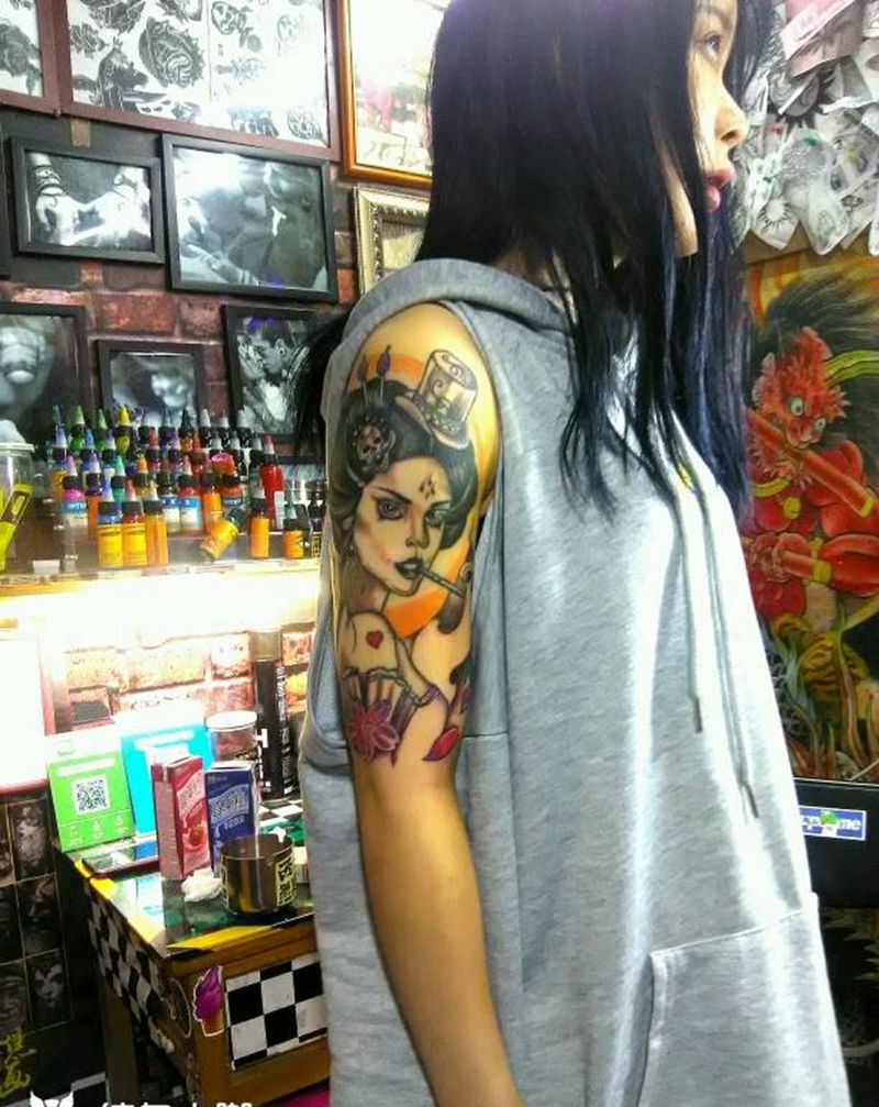 当前位置: 首页 >广东省佛山市纹身店-西樵鲤狮虎刺青纹身图案>艺妓拯救不开心纹身图片