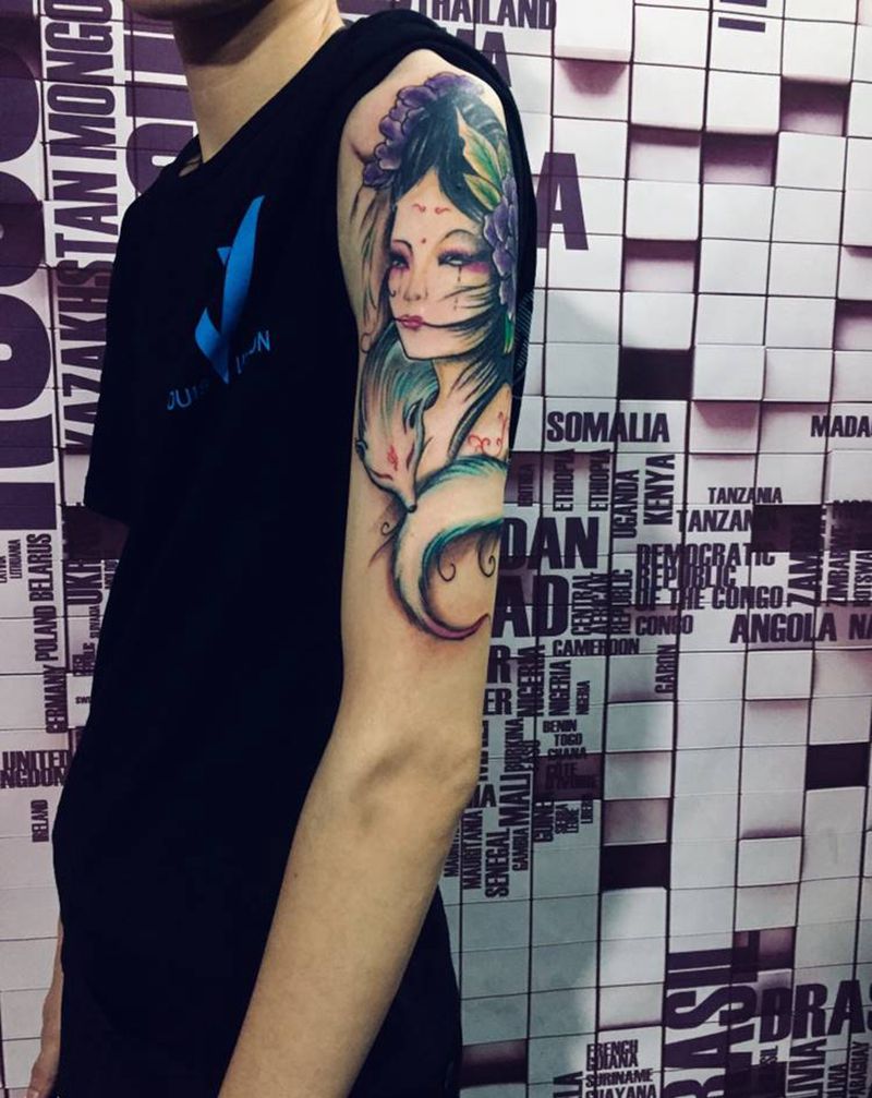 当前位置: 首页 >广东省佛山市纹身店-西樵鲤狮虎刺青纹身图案>艺妓纹身图片_手臂纹身图案