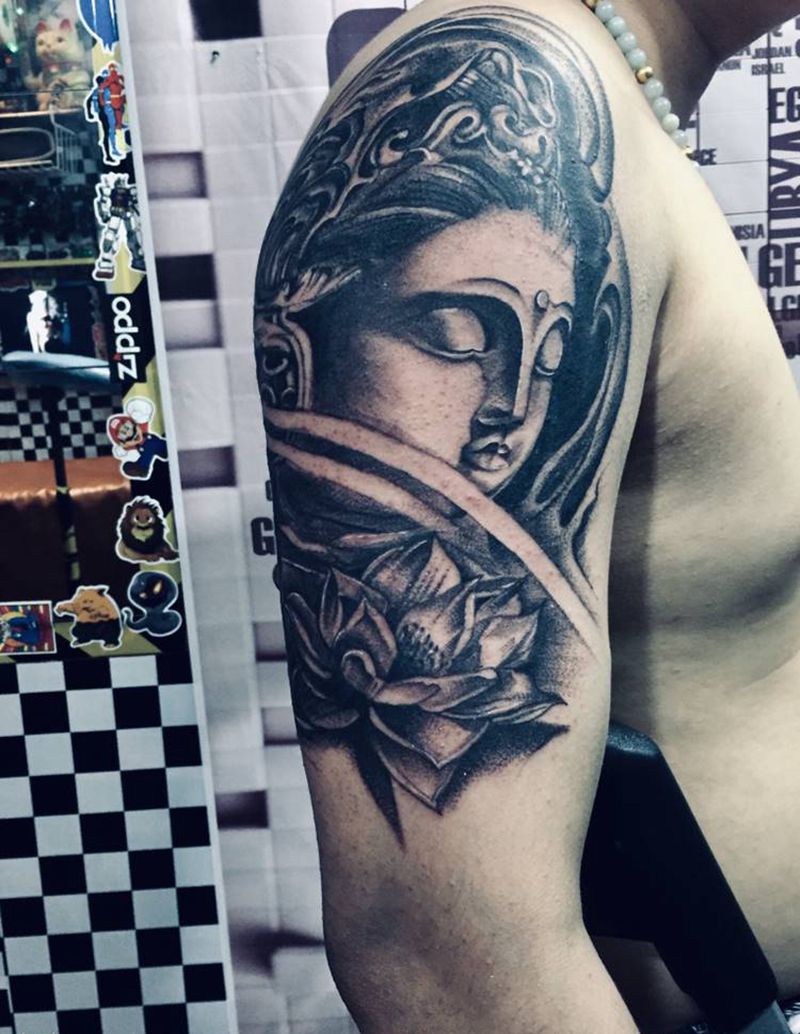 当前位置: 首页 >广东省佛山市纹身店-西樵鲤狮虎刺青纹身图案>佛头纹身图片_手臂纹身图案