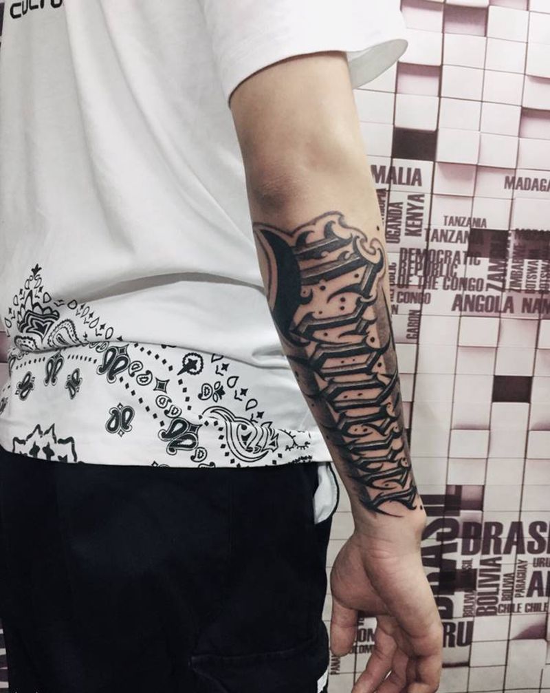 当前位置: 首页 >广东省佛山市纹身店-西樵鲤狮虎刺青纹身图案>花体英文纹身图片_手臂纹身图案