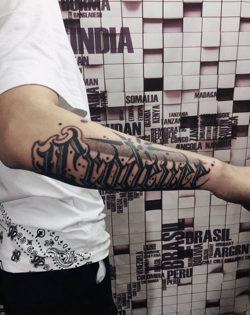当前位置: 首页 >广东省佛山市纹身店-西樵鲤狮虎刺青纹身图案>花体英文纹身图片_手臂纹身图案